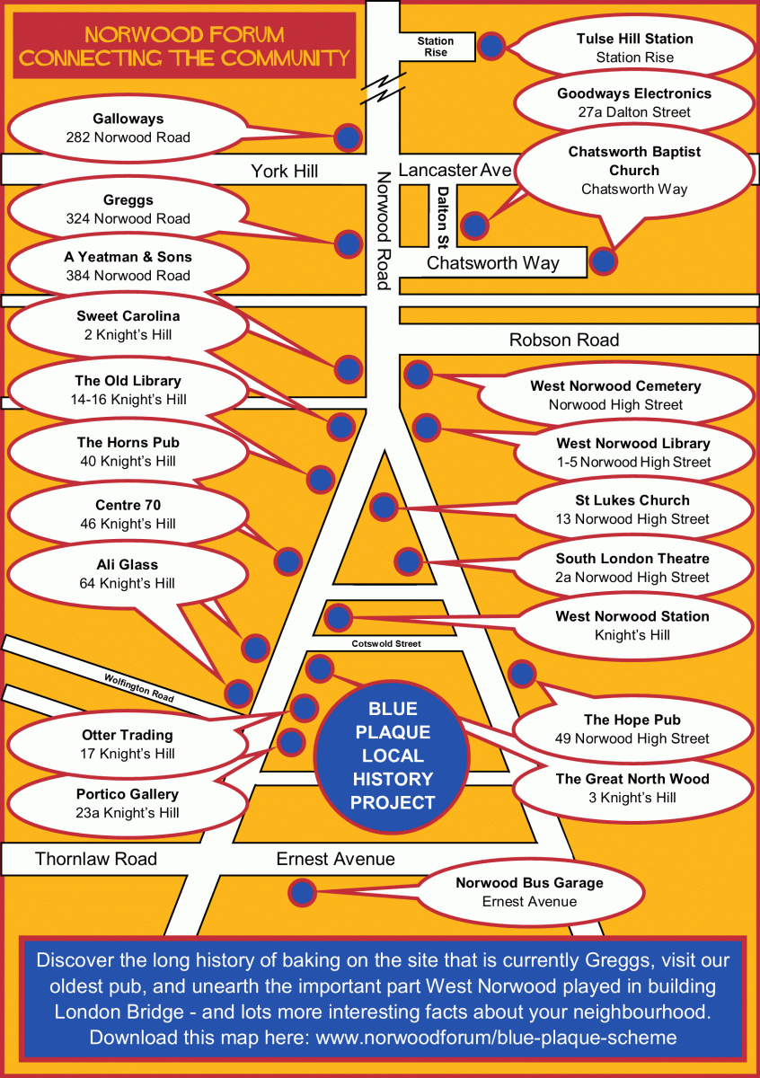 Our map will guide you to 21 blue plaques that you can search for across West Norwood. Discover the long history of baking on the site that is currently Greggs, visit our oldest pub, and unearth the important part West Norwood played in building London Bridge - and lots more interesting facts. Click on the map flyer to download, or use the Google map - both are below.