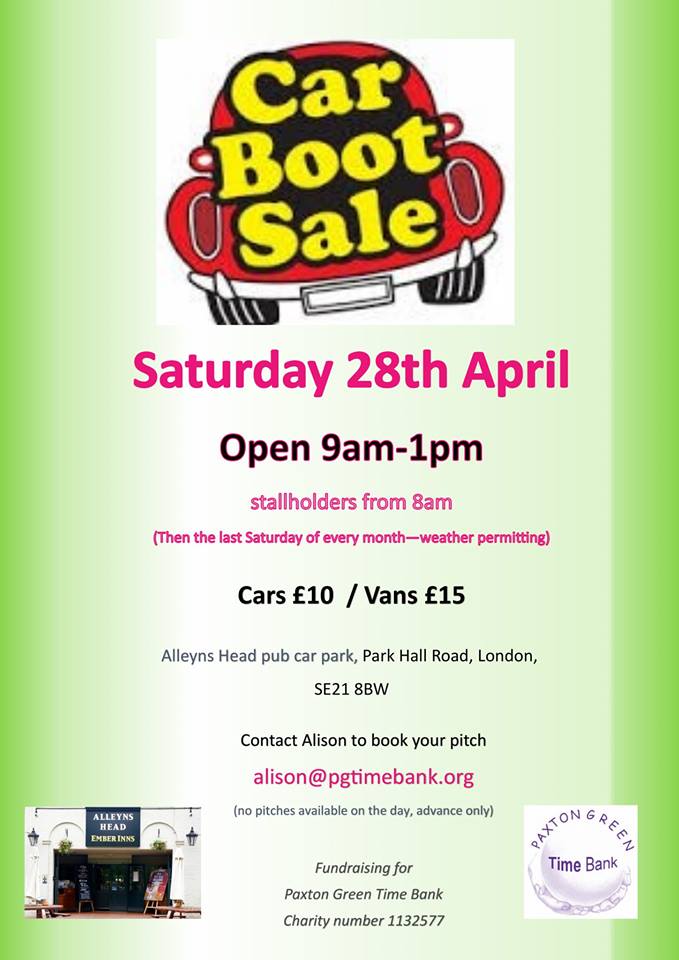 A car boot sale is being held on Saturday 28 April at the Alleyns Head pub to raise funds for Paxton Green Time Bank. If you want a pitch for a van or car please contact Alison. Further car boot sales willl follow on the last Saturday of each month - weather permitting.