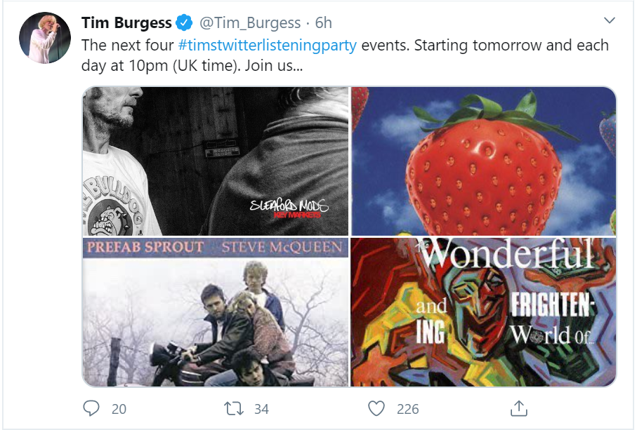 When was the last time you listened to an album all the way through? Listen to Tim Burgess (The Charlatans) talking about his Listening Party here. He says: ‘Put the record on (10pm), let it play through, share your thoughts on Twitter. Easy.’ #timstwitterlisteningparty