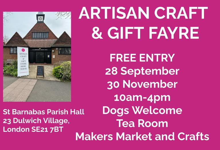 The Artisan Craft & Gift Fayre is back on Saturday 28 September 10am - 4pm at St Barnabas Parish Hall, 23 Dulwich Village, SE21 7BT.