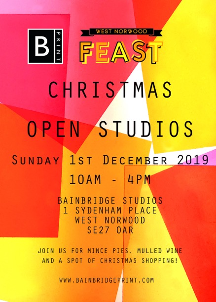 Open studios at Bainbridge Studios from 10-4pm, with mulled wine and mince pies whilst you do some Christmas shopping. http://bainbridgeprint.com/. Pop in during the last Feast of the year. And don’t miss the festive sing-along at the Great North Wood immediately straight after Feast.