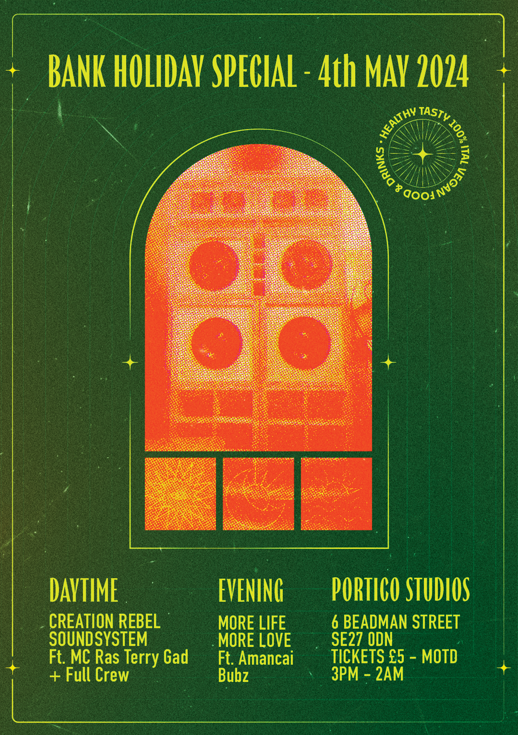 During the day in the courtyard there will be original roots music from Creation Rebel playing vinyl on their sound system.