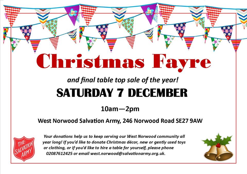 Further info.: Facebook, tel. 020 8761 2425 or email: west.norwood@salvationarmy.org.uk