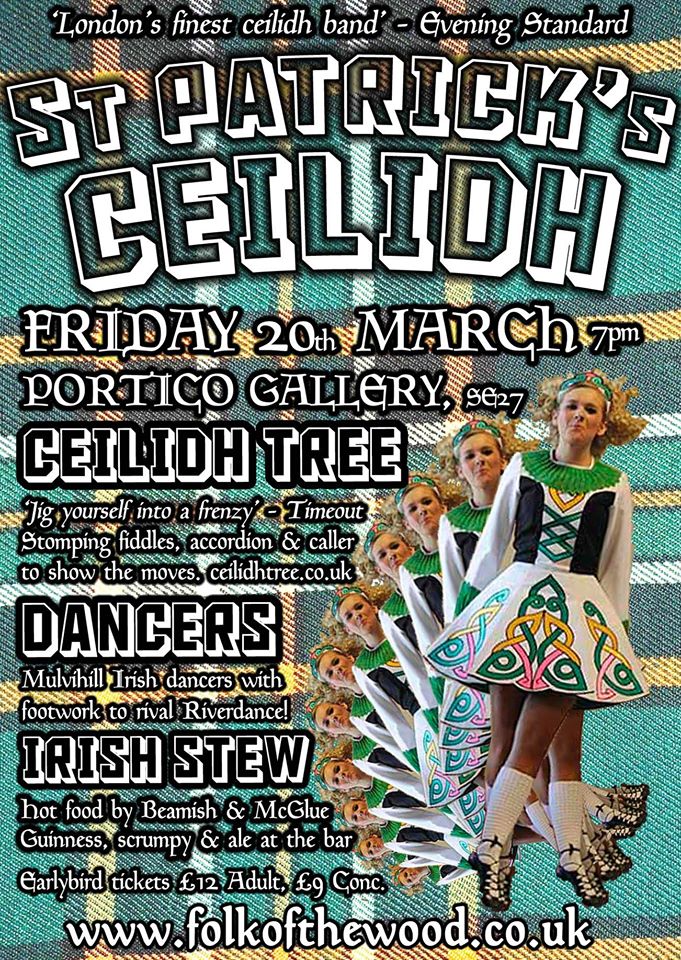 Showcasing the award winning dancers from the Mulvihill Academy of Irish Dance, a Folk of the Wood St Patrick's Ceilidh London. Mulvihill Academy of Irish Dance will be performing alongside acclaimed ceilidh band Ceilidh Tree who will perform three joyful sets of folk dance merriment with stomping fiddles, accordion and caller to show the moves ("Jig yourself into a frenzy" - Timeout). Hot Irish stew on sale by Beamish & McGlue #eventful plus full bar with Guinness, scrumpy and local ales. Top craic guaranteed!