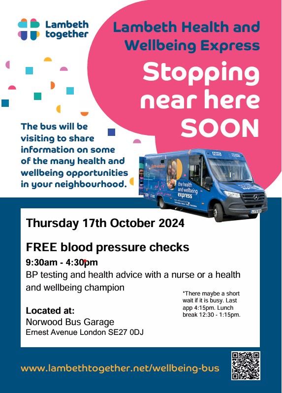 Further info: feel free to visit the website where you can find out more about the bus and see the most up to date schedule Lambeth's Health and Wellbeing Bus - Lambeth Together
