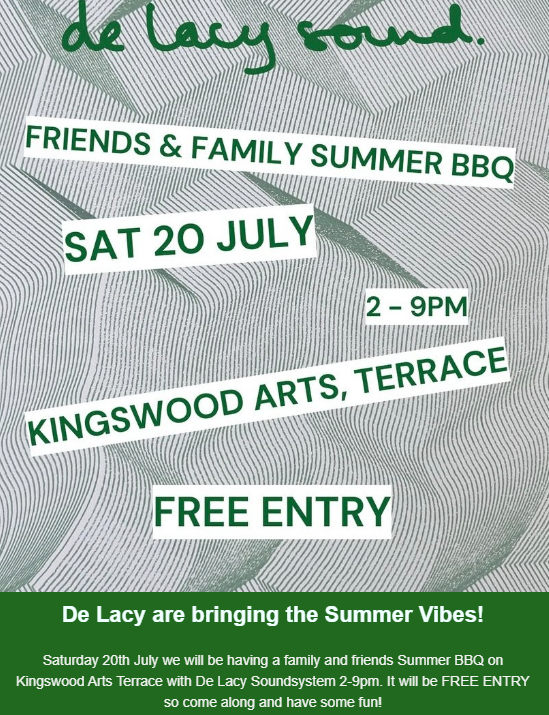 On Saturday 20 July Kingswood Arts will be having a family and friends Summer BBQ on Kingswood Arts Terrace with De Lacy Soundsystem from 2pm - 9pm. This event is FREE so come along and enjoy the fun!