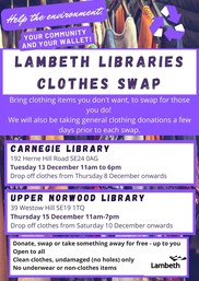 Lambeth Libraries are holding Clothes Swap Pop-ups, and this one is local. Drop off clothes from Saturday 10 December.