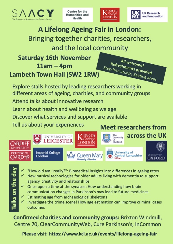King's College London (The Sciences of Ageing and the Culture of Youth - SAACY) is hosting this Lifelong Ageing Fair. The day-long event will be open to the public, bringing together academic researchers, third-sector organisations, and the local community around King’s and beyond.