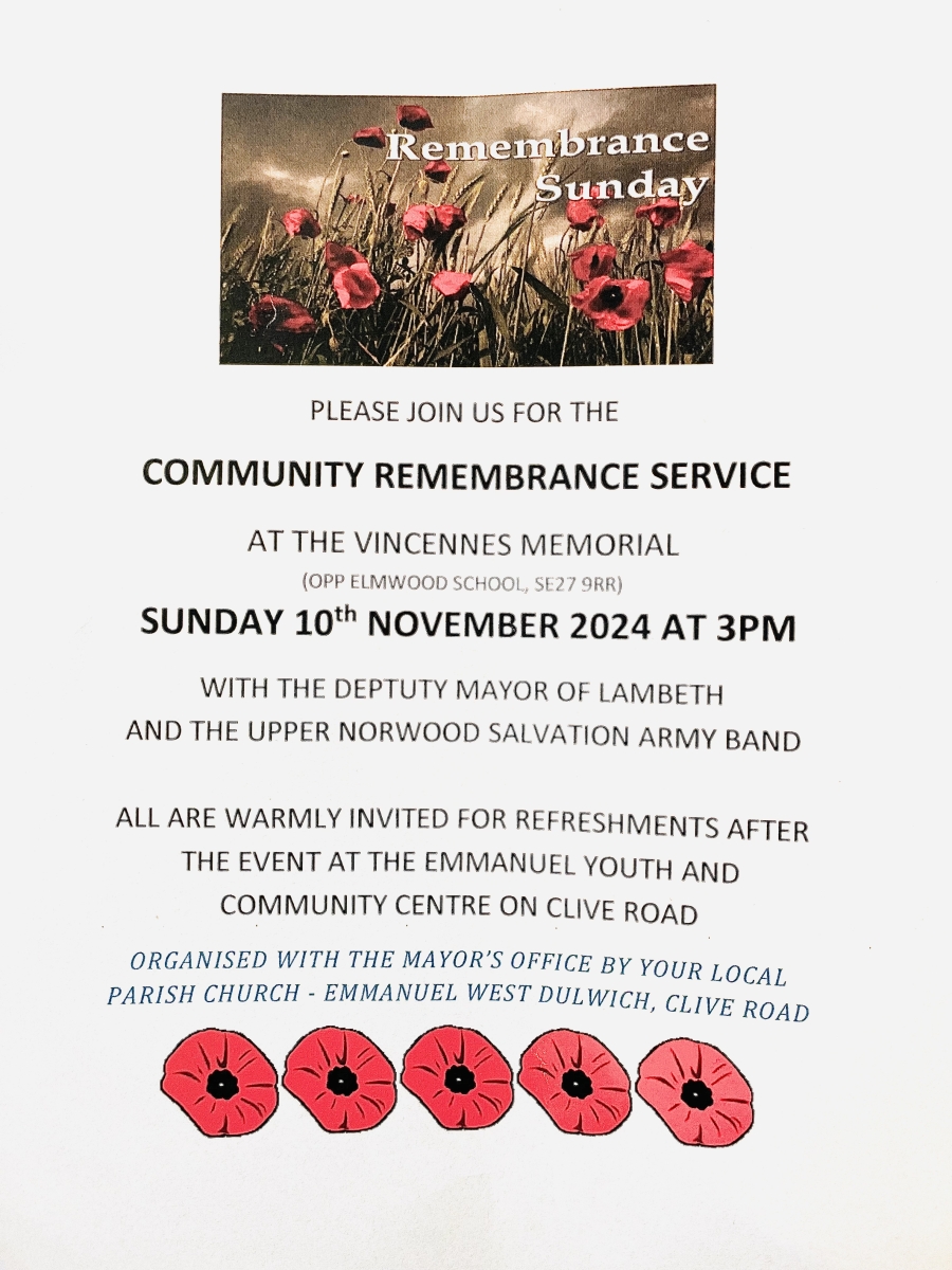 The Vincennes War Memorial in West Norwood, London will host a Remembrance Day Service on Remembrance Sunday and all are welcome to attend.