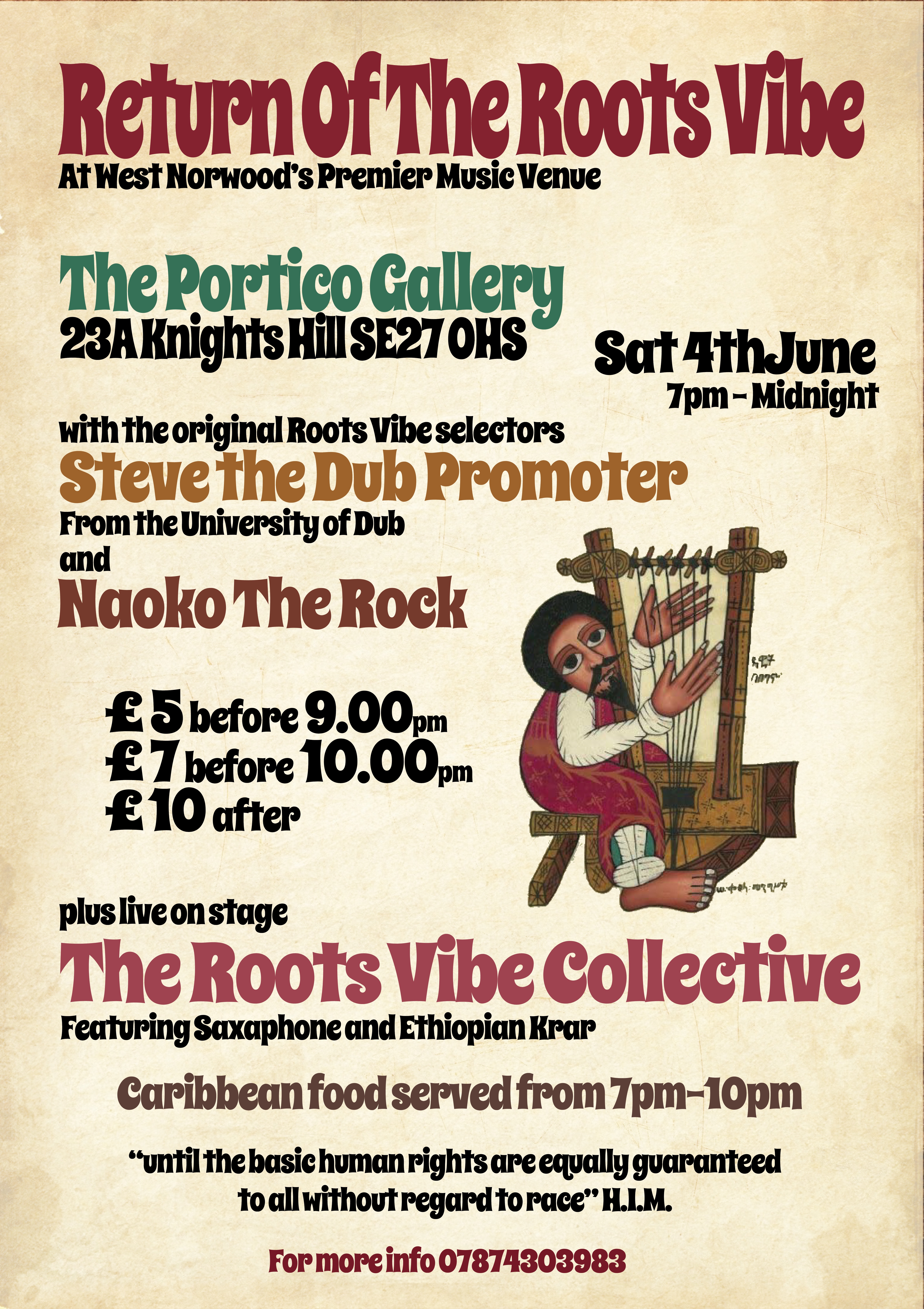 Steve the Dub Promoter with Naoko the Rock plus live on stage The Roots Vibe Collective featureing saxophone and Ethiopian Krar.