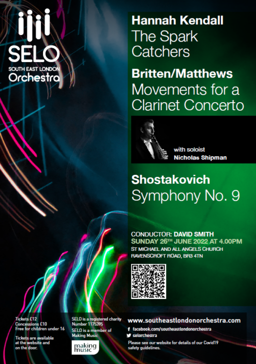 Hear local amateur musicians from Norwood, Gipsy Hill, Anerley and Beckenham play music by Kendall, Britten and Shostakovich. The orchestra will be joined by professional clarinet soloist Nick Shipman. Tea and home made cakes available in the interval.