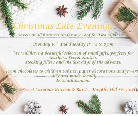 Sweet Carolina Kitchen and Bar will showcase local craft traders. There will be a range of small items suitable for teacher gifts, Secret Santa, stocking fillers, etc. - perfect for those last minute gifts! So, plenty of time still to #shoplocal in West Norwood in the last few days before Christmas week.