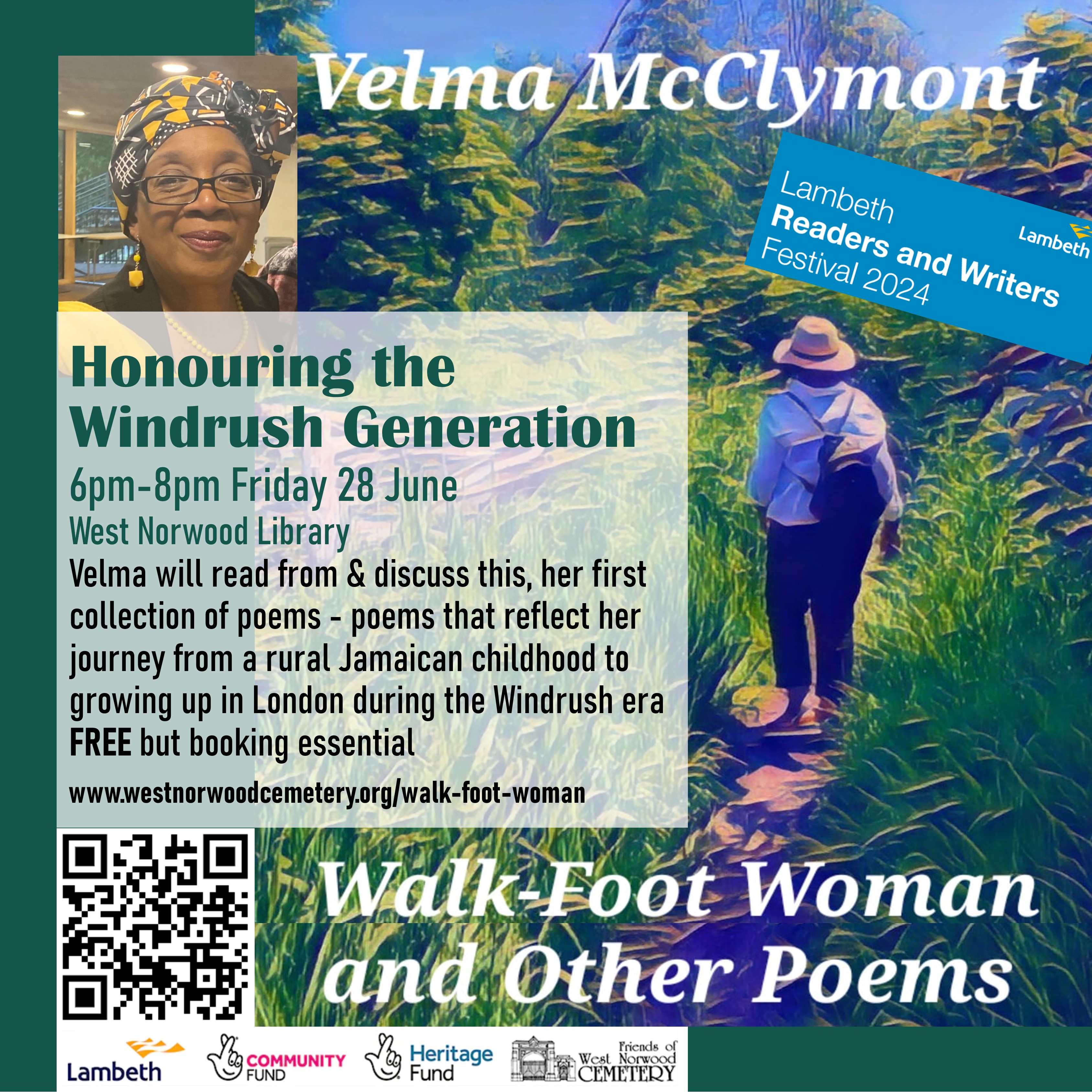 Join author Dr Velma McClymont, honouring the Windrush Generation. There will be a presentation, Q & A, and a chance to purchase a signed copy of Dr McClymont's new Windrush book, Walk-Foot Woman and Other Poems..