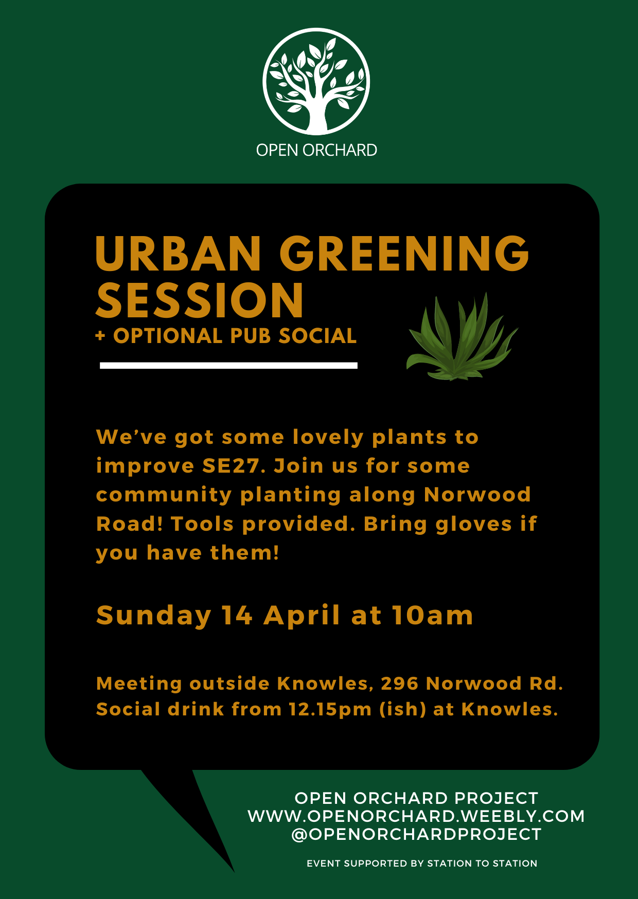 Open Orchard are running a community planting session along Norwood Road, followed by an optional pub social. All the details you need are in the flyer below.