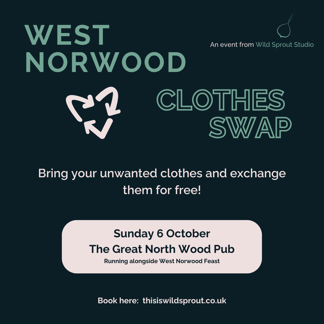 The Great North Wood will be hosting a clothes swap with Wild Sprout Studio on Sunday 6 October in the upstairs function room. Bring your unwanted clothes and exchange them for free!