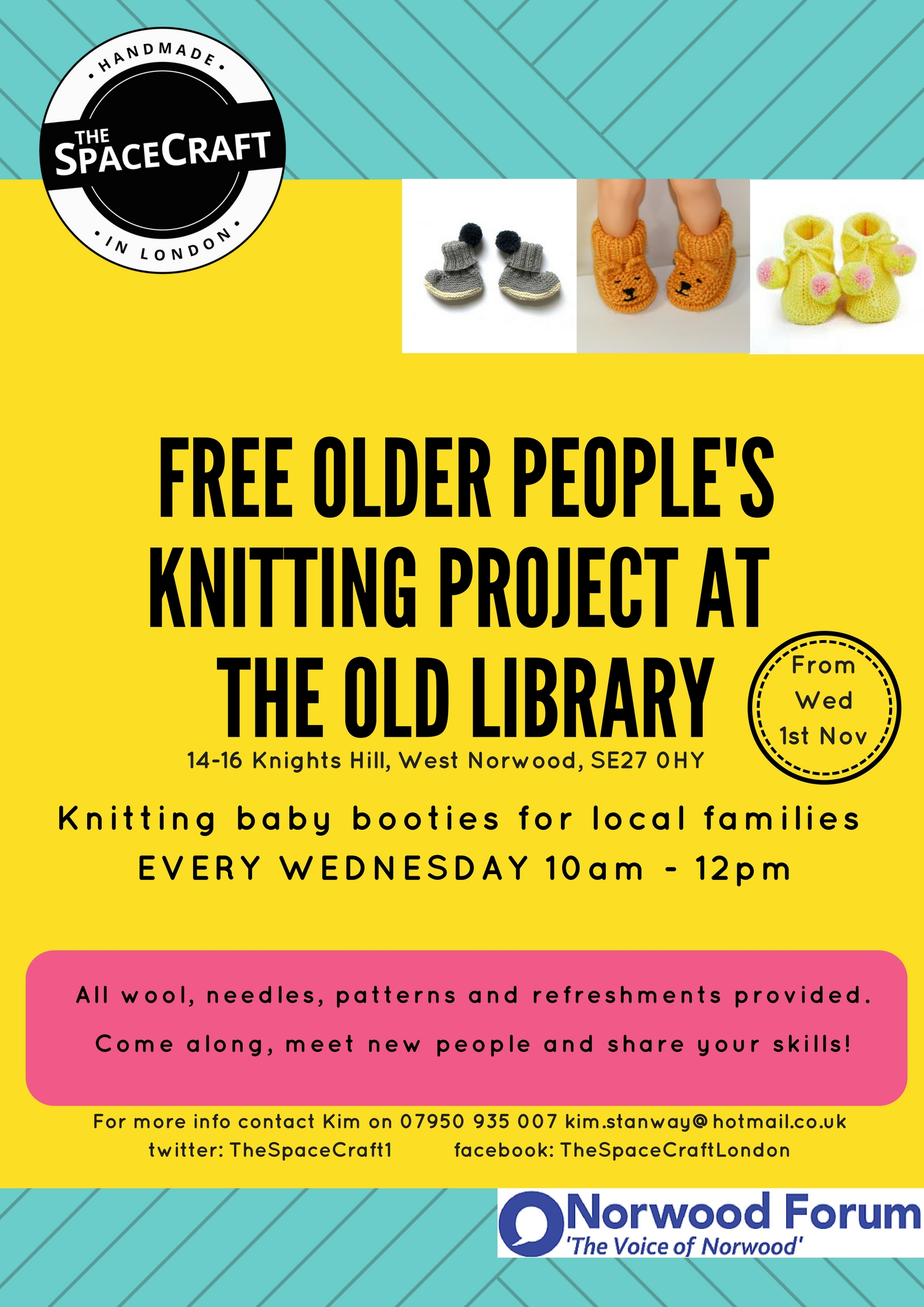 The SpaceCraft's knitting project free knitting sessions began yesterday and will continue every Wednesday (10am-12noon). All older knitters locally, as well as knitters of all ages who would like to come and volunteer to help support any less confident older knitters, are most welcome. All materials (wool, patterns, needles) and refreshments are provided and baby products - booties, hats, mitts etc will all be knitted!