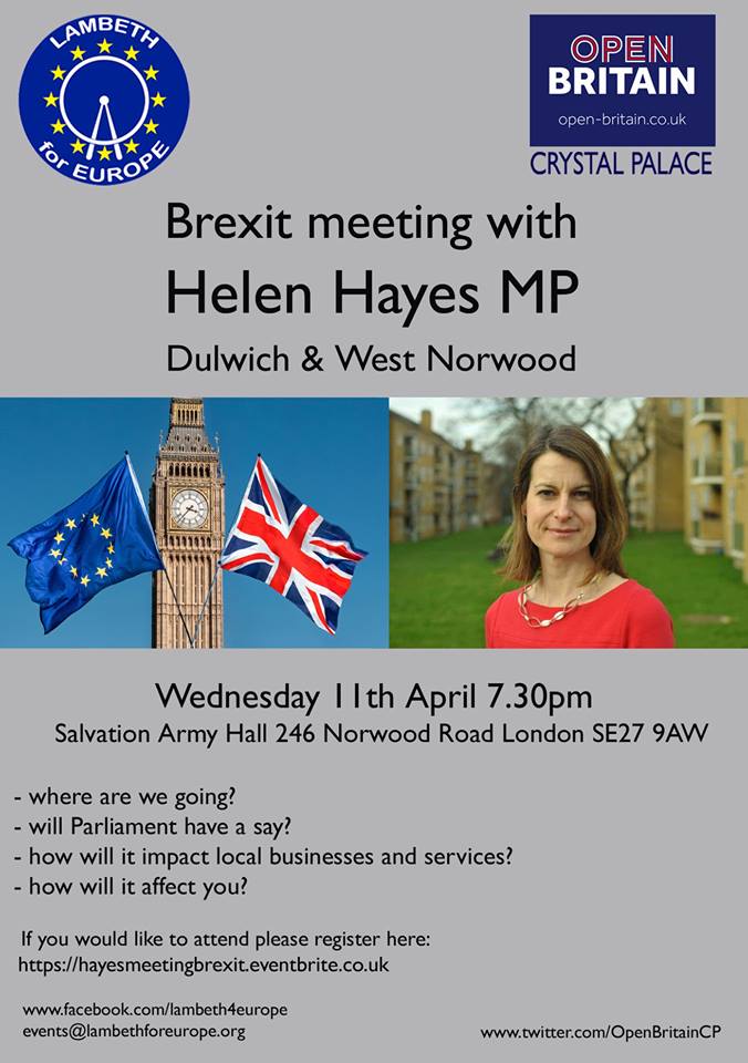 Lambeth For Europe is hosting a meeting on Brexit with the Dulwich and West Norwood MP Helen Hayes on Wednesday 11 April.