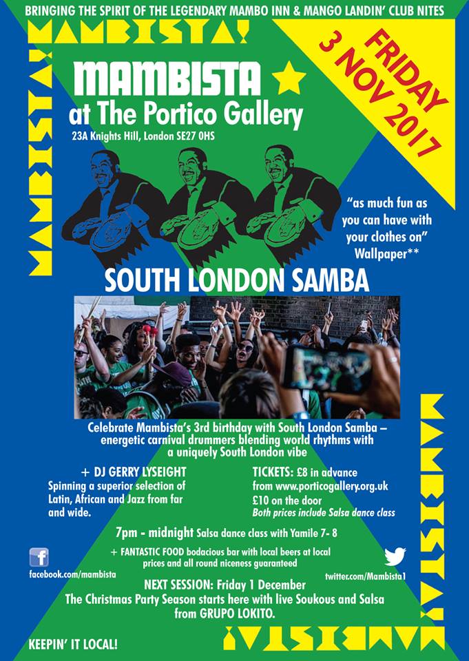 Mambista will be celebrating its third birthday with South London Samba who will be bringing their A Team. Brazilian carnival comes to The Portico Gallery! DJ Gerry Lyseight will of course also be spinning sounds until midnight. The evening begins at 7pm with the all-comers Salsa Dance Class led by Luis.