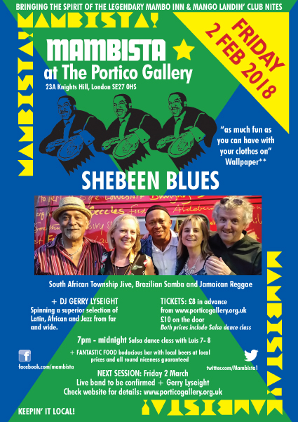 The next monthly Mambista aka The Latin, African and Jazz Dance Party at The Portico with DJ Gerry Lyeseight with Shebeen Blues as special guests.