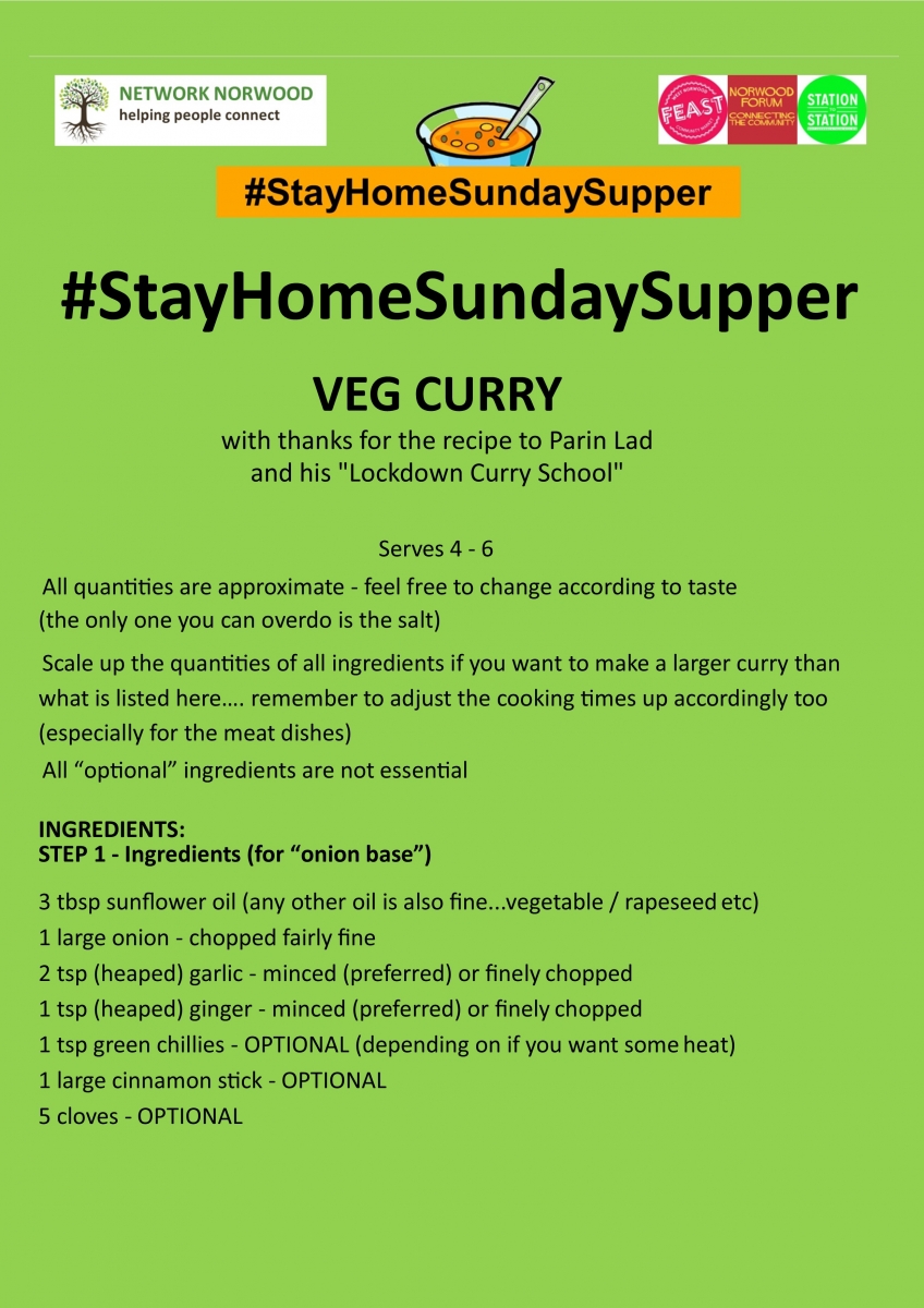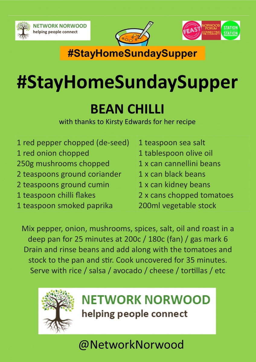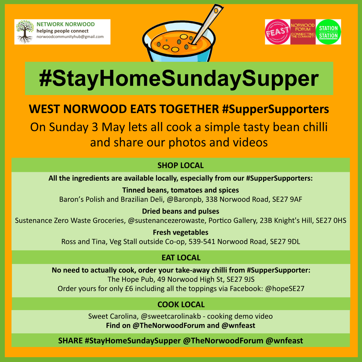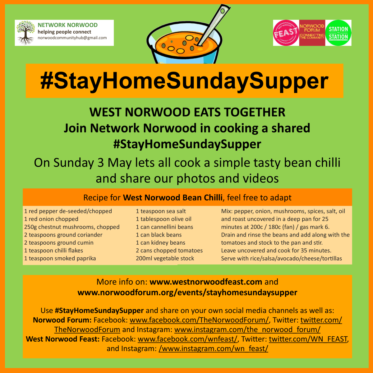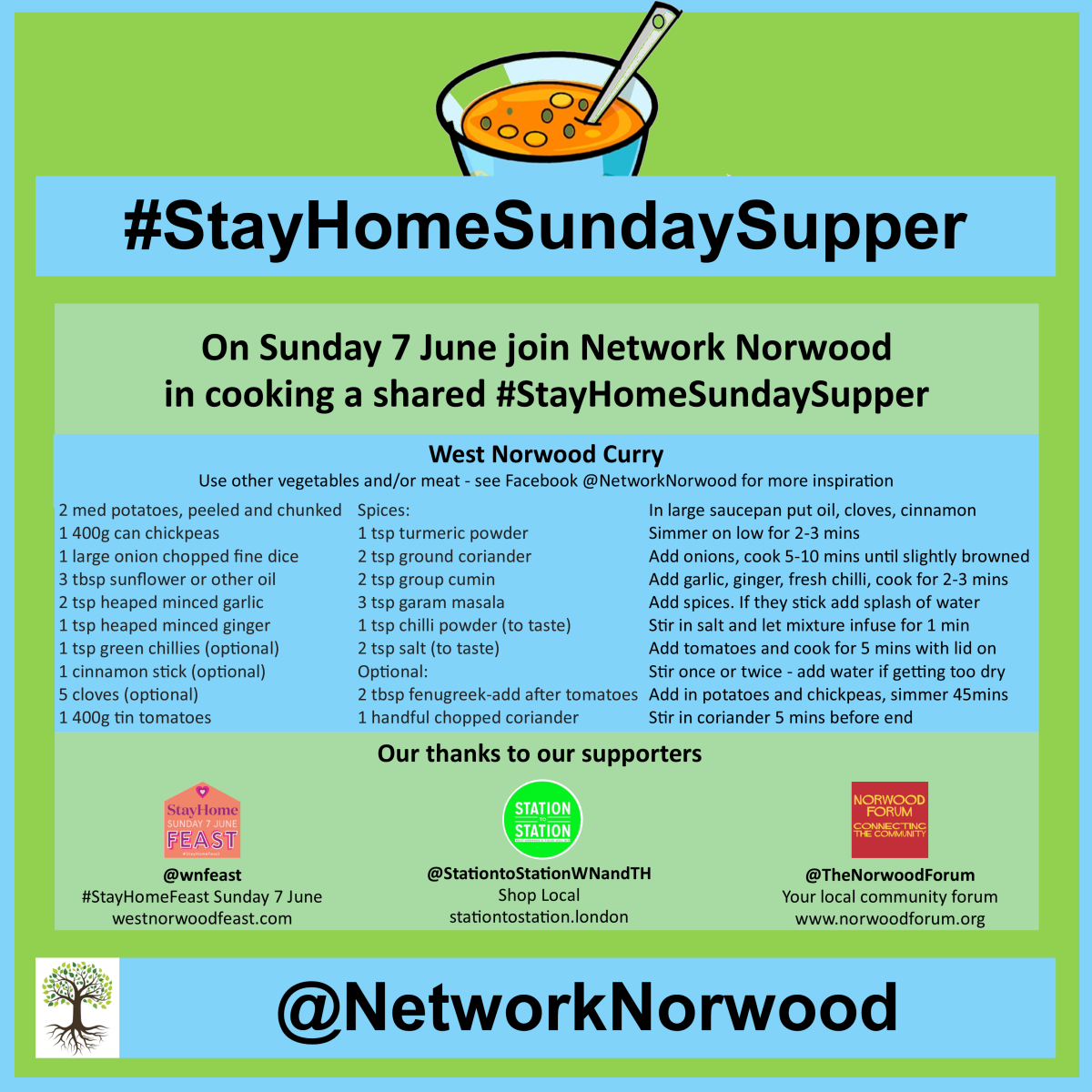 Due to the current situation with Coronavirus, Network Norwood cannot run our usual activities, but with the support of Norwood Forum and West Norwood Feast, we are staging our very first community event: #StayHomeSundaySupper.