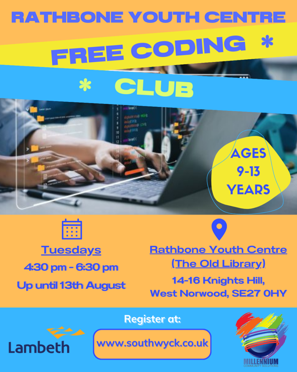 Millennium Community Solutions are launching a new Coding Club at the Rathbone Youth Centre in West Norwood (The Old Library). Aimed at ages 9-13 years, its perfect for children eager to dive into the world of coding through fun and interactive methods, including designing and building online games through coding and more.