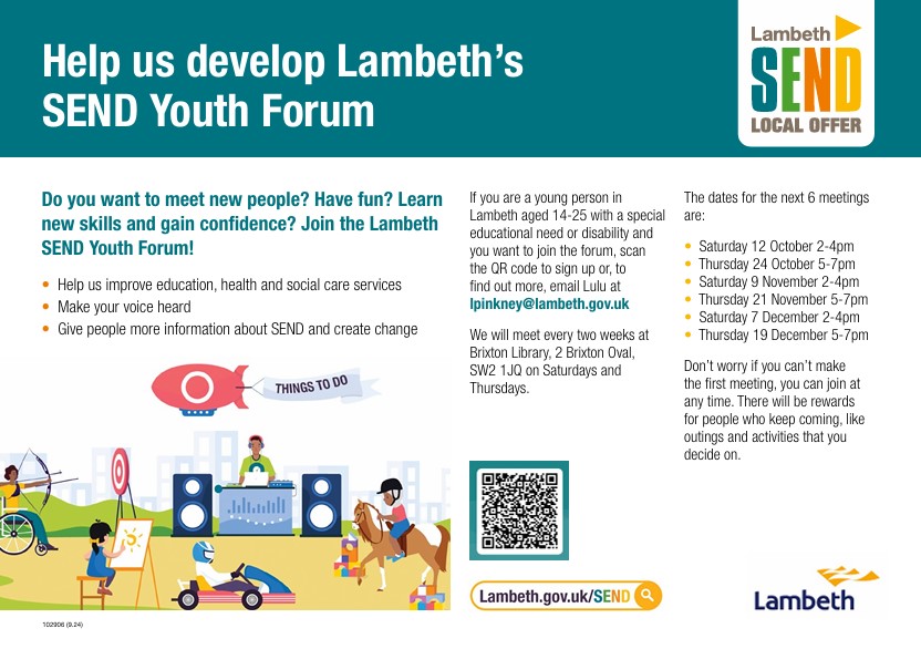 Lambeth Council is relaunching its Special Educational Needs and Disabilities (SEND) Youth Forum, a group for young people aged 14-25 with SEND who live and/or go to school in Lambeth. This forum is for young people who want to improve local services, work on fun projects, learn new skills and meet new people! The Forum is having its first meeting on Saturday 12 October from 2-4pm at Brixton Library. Drinks and snacks will be provided. Please see the flyer below to find out more.