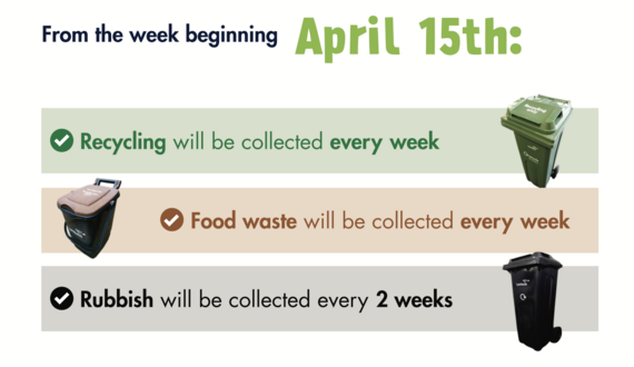 Further to our earlier stories, a reminder that from Monday 15 April, black bin rubbish collections will take place every two weeks. The final weekly collection will be in the week commencing 8 April. Your green recycling bin, food waste bin and garden waste bag (if you subscribe to the garden waste service) will still be emptied every week.