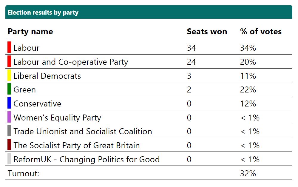 Labour increased its large majority on Lambeth Council by one seat at the 5 May 2022 elections: