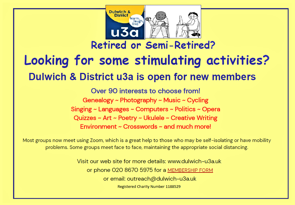 u3a is a UK-wide movement of locally-run interest groups that provide a wide range of opportunities to come together to learn for fun. Members explore new ideas, skills and activities together. The local Dulwich and District u3a is seeking new members - see details of the wide range of activites now available and how to join in flyer below.