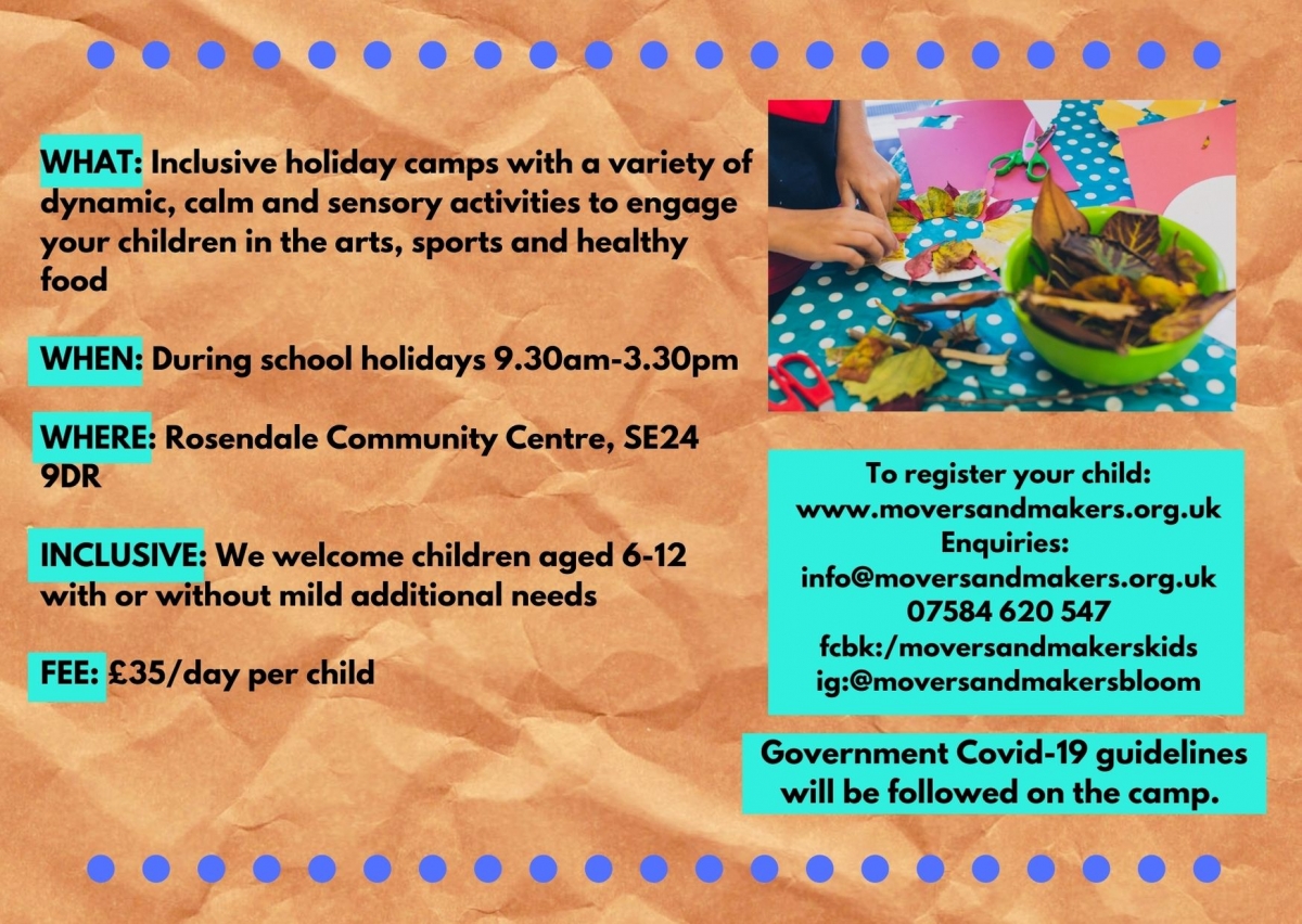 Movers & Makers C.I.C are so excited to be hosting inclusive kids activities in the community this summer! Their first inclusive kids holiday camp at Rosendale Community Centre took place July 26 -28 and they are looking forward to seeing new and familiar faces at the late August inclusive kids holiday camp for more play, craft, acting, moving! Details and how to register your child aged 6-12 years who has or does not have mild additional needs, can be found here: www.moversandmakers.org.uk. Photos and testimonials from their June half term 2021 camp can also be found on their website.