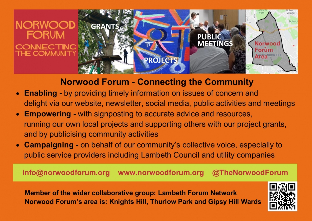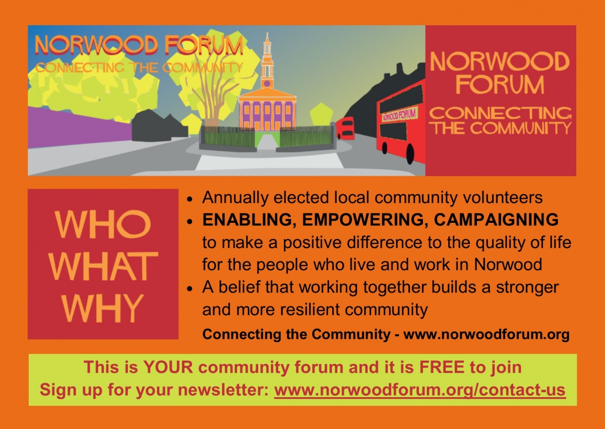 Norwood Forum is seeking enthusiastic new volunteers to help their local community in the Gipsy Hill, Knights Hill, and Thurlow Park Wards. Our tag-line is ‘Connecting the Community’ and the Forum actively engages across a wide range of issues from local planning, creative projects, and crime reduction, through to supporting many local groups, such as youth and pensioner organisations.
