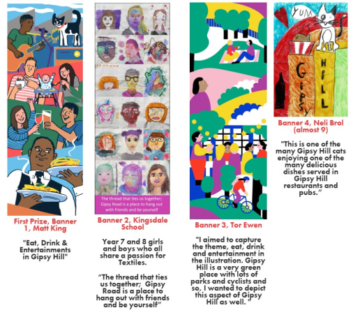 The Friends of Gipsy Hill have announced the winners of their recent banner competition (see picture below). The four selected entries will be displayed on the two double sided lamp post banners on the entrance to Gipsy Road, off the Paxton roundabout. First prize goes to Matt King, with a meal for two at Manuel’s.