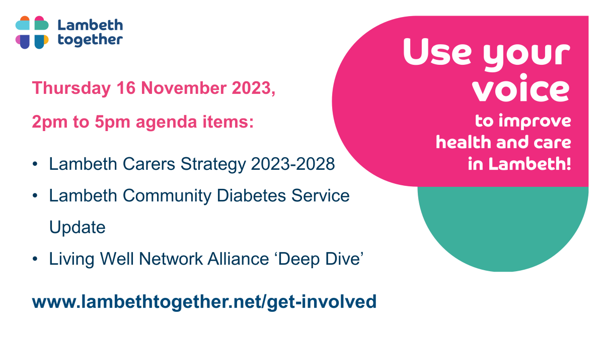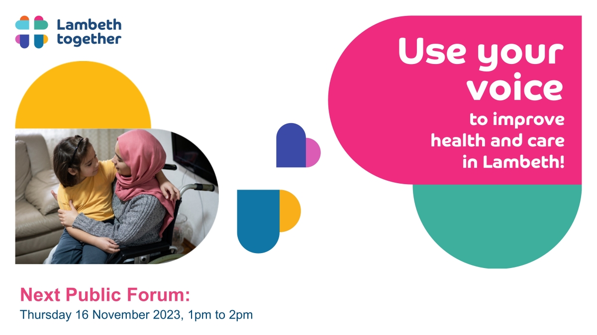 The next Lambeth Together Public Forum is on Thursday 16 November 2023 from 1:00 to 2:00pm. This is an open space for local communities to meet decision-makers, ask questions and raise important issues with the leaders of Lambeth’s health and care system. There is no agenda and you do not need to sign up to participate.