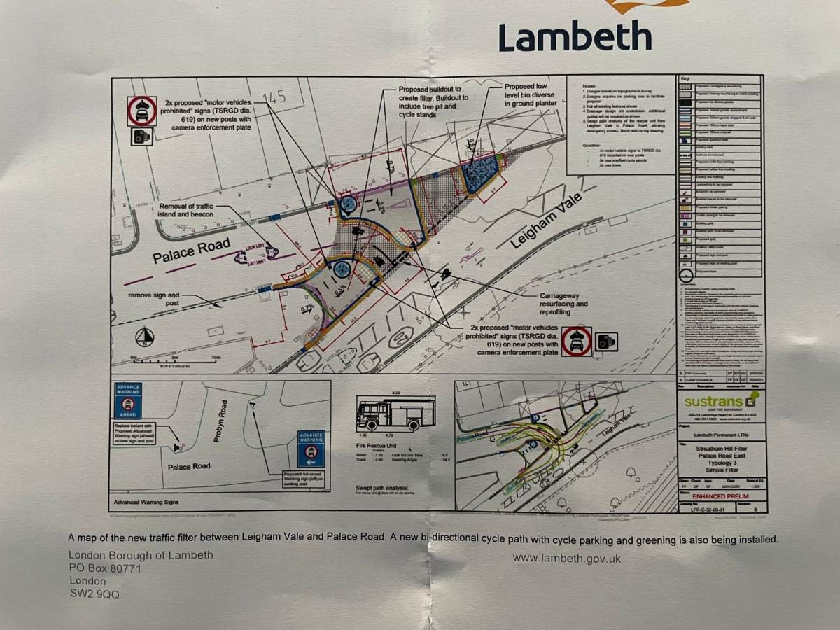 Lambeth Council is proposing to add a new traffic filter at Leigham Vale/Palace Road in order to stop through traffic using those roads and Probyn Road to drive dirctly between the A215 (Norwood Road) and A205 (Christchurch Road) and bypass the Tulse Hill gyratory. A new cycle path and greening is also included in the scheme. Local residents were advised by letter dated 11 November.