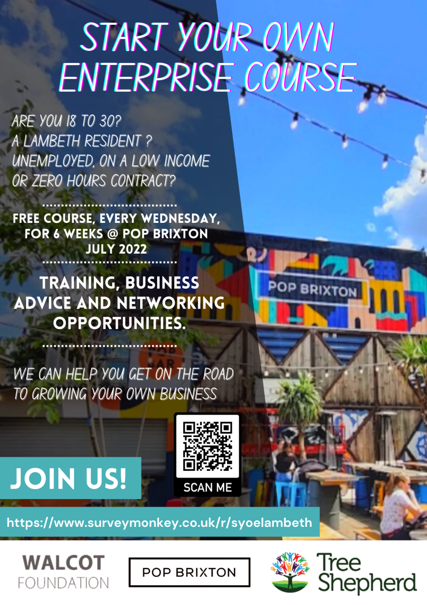 The course will go through the basics of setting up and running a business and provide opportunities for mentoring, networking, test trading plus more and will be delivered in Pop Brixton. They hope to start the course on 27 July and need to recruit 15 people.