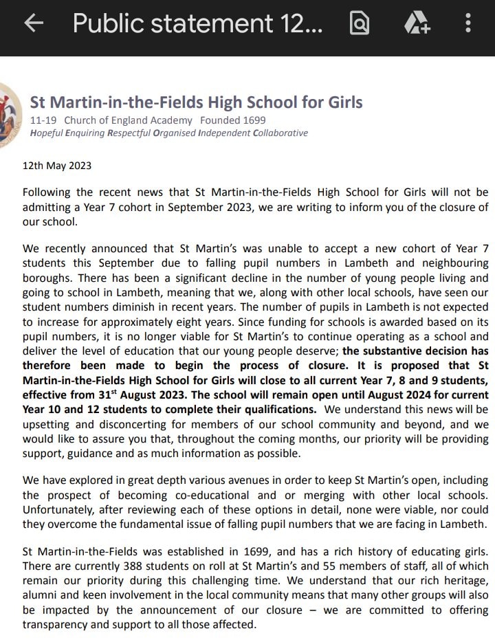 St. Martins-in-the-Fields High School for Girls on Tulse Hill has announced it is to close to Years 7, 8 & 9 from 31 August 2023, and remain open until August 2024 only to enable Years 10 & 12 to complete their qualifications. See announcement letter below for more information.