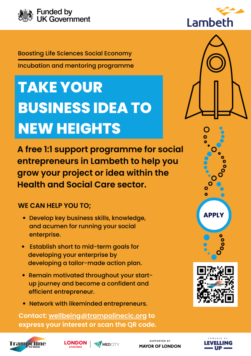 If you are a Lambeth or Southwark resident and have a community project, business idea, or ongoing social activity related to health, wellbeing, or social care, this is an opportunity for you. Benefits of joining the programme: