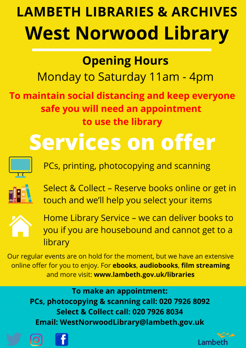 We're pleased to confirm, West Norwood Library is re-opening from Monday 20 July 2020. Open from 11am to 4pm Monday to Saturday by appointment only, though you can can return your books without an appointment: