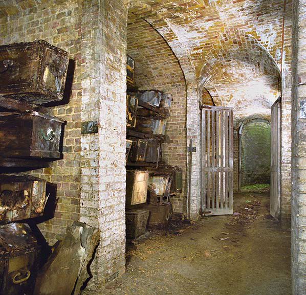There are some 2,500 coffins stored often stacked on top of each other in the six aisles and 95 vaults off the central gallery. At the centre is the hydraulic catafalque (coffin lift) designed by Bramah & Robinson dated 1839 which was used to transfer coffins from the chapel above down into the catacombs below. Whilst the catacombs have suffered from damp and flooding over the years and many of the wooden coffins are in a state of decay the bodies remain intact. This is because coffins not buried in the ground are required to be lead lined by law.