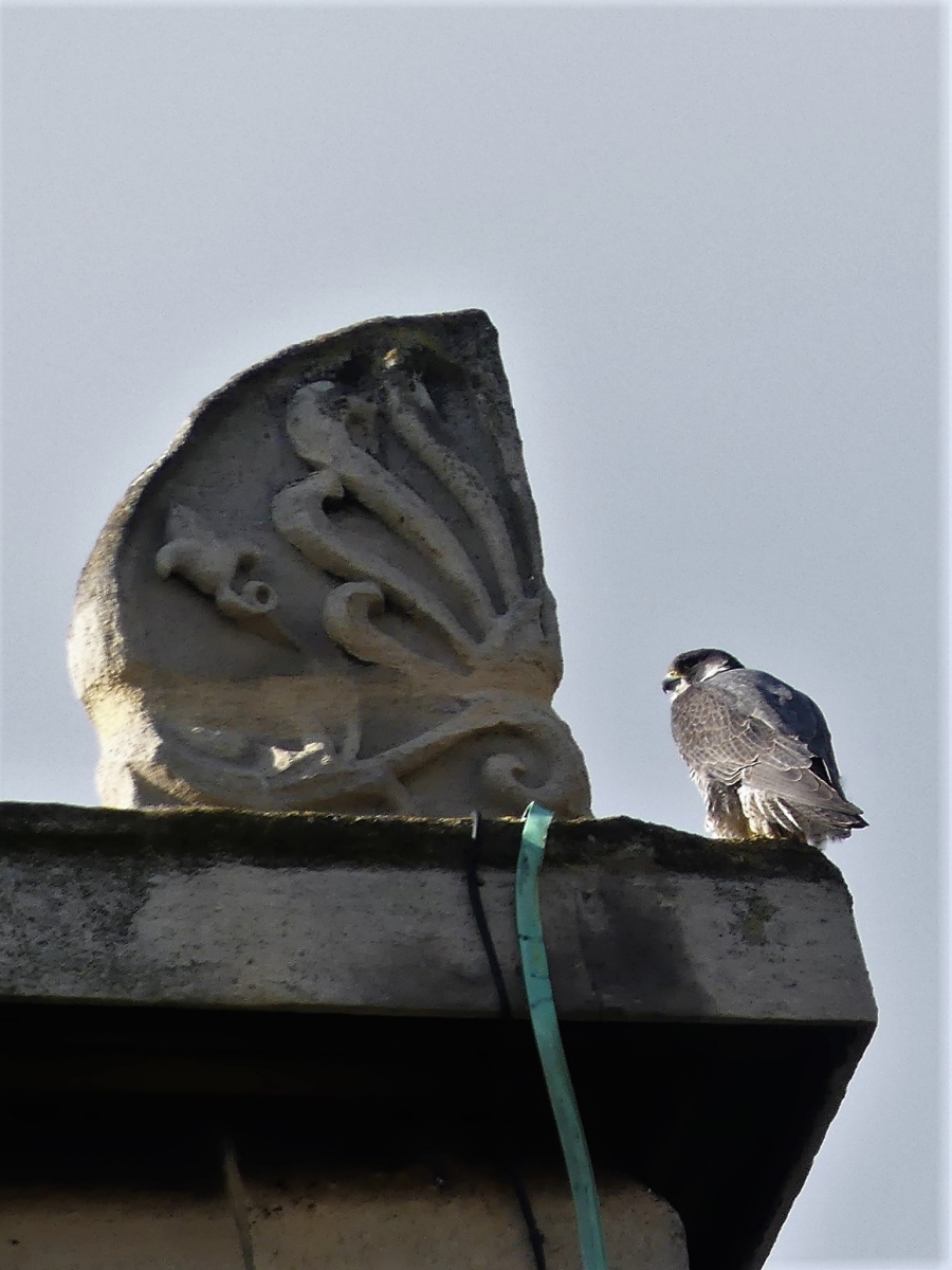 Now West Norwood has its own peregrines. Look up whenever you’re near St Luke’s – up into the bell tower, where you might see one perched, wind ruffling their plumage; or up into the sky – their distinctive silhouette, with pointed wings and heavy chest, can be the high point of any day. Yesterday the female (larger than the male) flew low over Platform 1 of West Norwood station and up into the tower as I waited for a train.