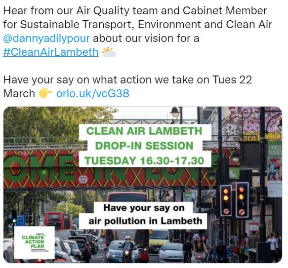 Lambeth Council is holding an online drop-in session for residents to have their say on the Council's Air Quality Action Plan.