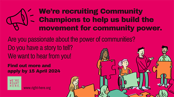 Moving into an election year that is dominated by ever tighter public budgets and overlapping environmental, healthcare and poverty crises, there is an enormous need to ramp up calls for community power. To do this We're Right Here aim to build on the work of brilliant community leaders by involving more people from a diverse range of places and communities in their campaign. This is why they are now recruiting 10-12 ‘Community Champions’.