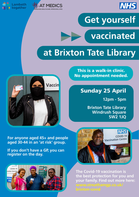 The NHS in Lambeth will be running a pop-up COVID-19 vaccination clinic at Brixton Library this Sunday 25 April from 12noon - 5pm. For anyone aged 45 or over and people aged 30-44 in an "at risk" group. If you do not have a GP, you can register on the day. All information in this flyer: