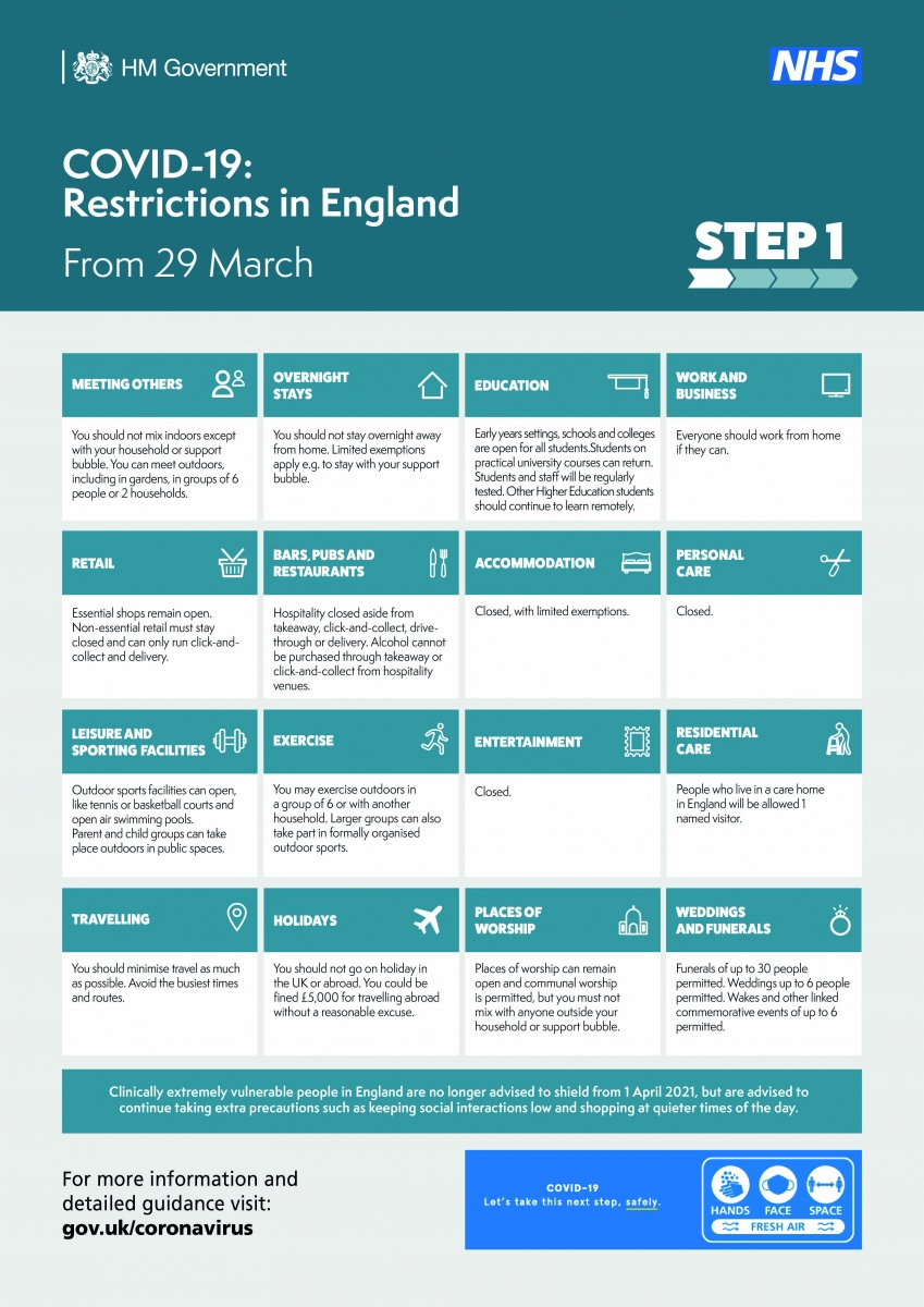 You can also read the ‘COVID-19 Response - Spring 2021’ web page for more information on the roadmap out of lockdown in England.