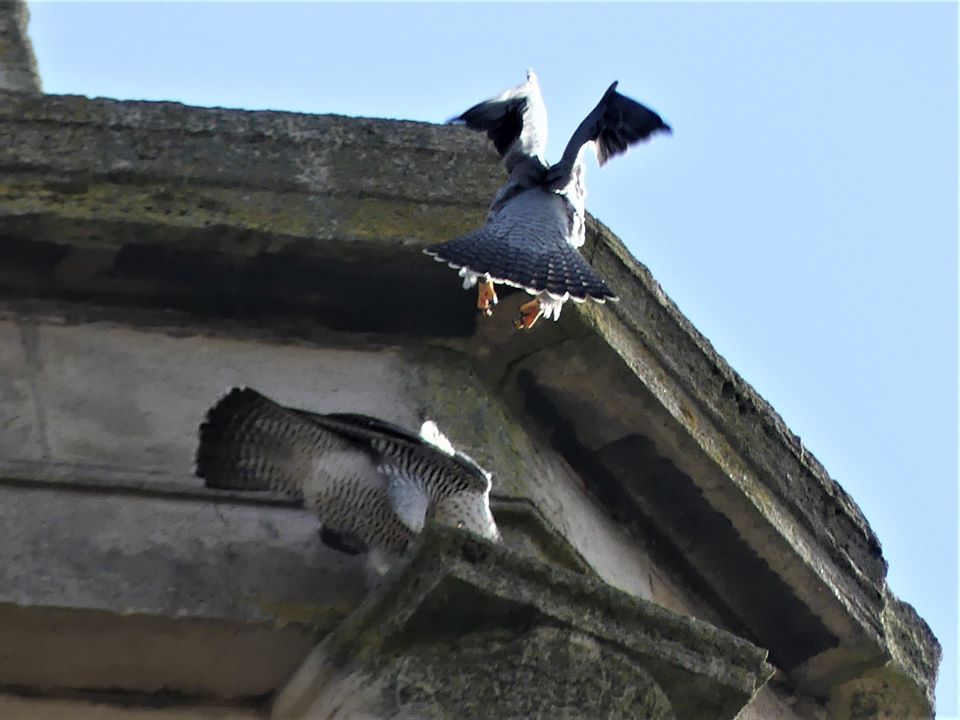So, when you are able to be in the town centre, look up and you might see one or more of our Peregrines. Perhaps high up on the St Luke’s bell tower, with the wind ruffling their plumage, or up in the sky with their distinctive silhouette, pointed wings and heavy chest. If you’re really lucky, you’ll see them hunting, wings tucked in, diving in a thrilling ‘stoop’ which might reach speeds of 200 mph.