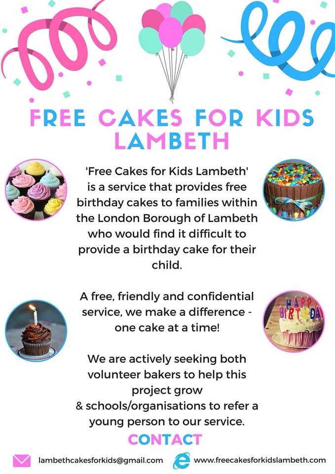 A new service to provide free birthday cakes to families in Lambeth who would find it difficult to provide a birthday cake for their child. Its a free, friendly and confidential service. Volunteer bakers are also sought.