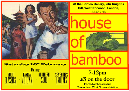 Back again at the Portico Gallery the House of Bamboo returns to give you another night of top tunes. Playing soul from the 60’s & 70’s, Motown and Northern Soul and with guest DJs Jacob Flack and Jack Manley.