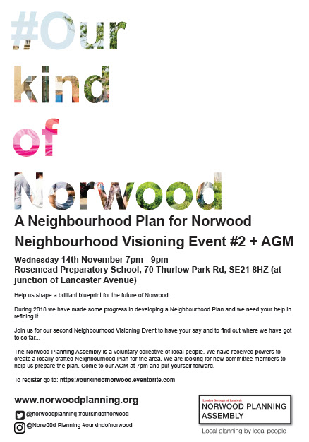The Norwood Planning Assembly is a group of local volunteers who are creating a Neighbourhood Plan for Norwood. The aim is to enable local people to set the long term vision and planning policy for the area and our Neighbourhood Plan will set out policies and guidelines to support the growth and evolution of Norwood to 2040. Please do go along on 14 November (7pm) at Rosemead School, 70 Thurlow Park Road, to help shape Norwood's future.
