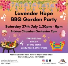 The Lavender Hope annual BBQ garden party is being held on Saturday 27 July 1.30pm - 8pm. Brixton Chamber Orchestra will be there too LIVE at 7pm. |