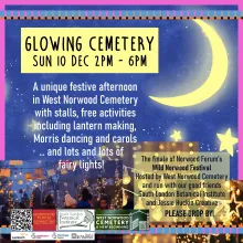 Join us for a final Wild Norwood festive event in the cemetery with stalls hosting all kinds of activities with something for all ages to enjoy, along with Morris Dancing from the Tatterjack Morris and carol singing - all lit with fairy lights. This event is run in partnership with our good friends South London Botanical Institute. They cannot run their usual 'Glowing Garden', so in collaboration with West Norwood Cemetery National Lottery Fund project we are running a 'Glowing Cemetery' instead! All the activities are FREE - just drop-in for some festive fun - you cant miss us for all the fairy lights just inside on the cemetery forecourt.